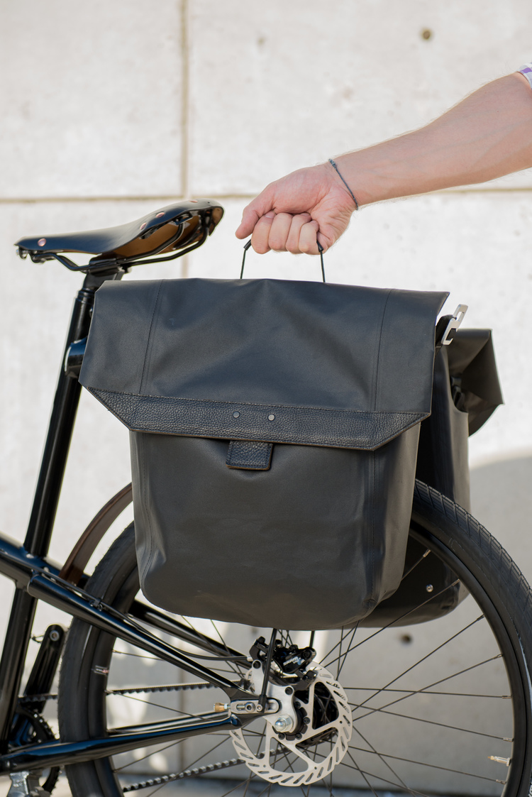 - Custom design Terrazign grab-and-go waterproof panniers with stow-away, messenger-style shoulder strap