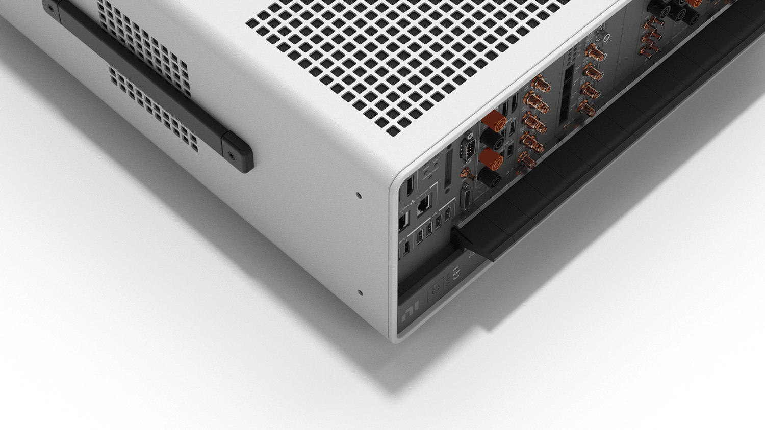 PXI (PCI eXtensions for Instrumentation) is NI's flagship product and serves as a showcase for the new design language. Venting is arranged in strict square patterns, emphasizing precision and order while also echoing the NI logo. The housing is highly directional: dark gray end caps highlight the technology inside and indicate an access/interaction point. These interfaces are recessed on each side, giving practical protection to the ports and space for airflow in the rear. They also serve to visually emphasizing the clean white protective housing which wraps tightly around the technological core.