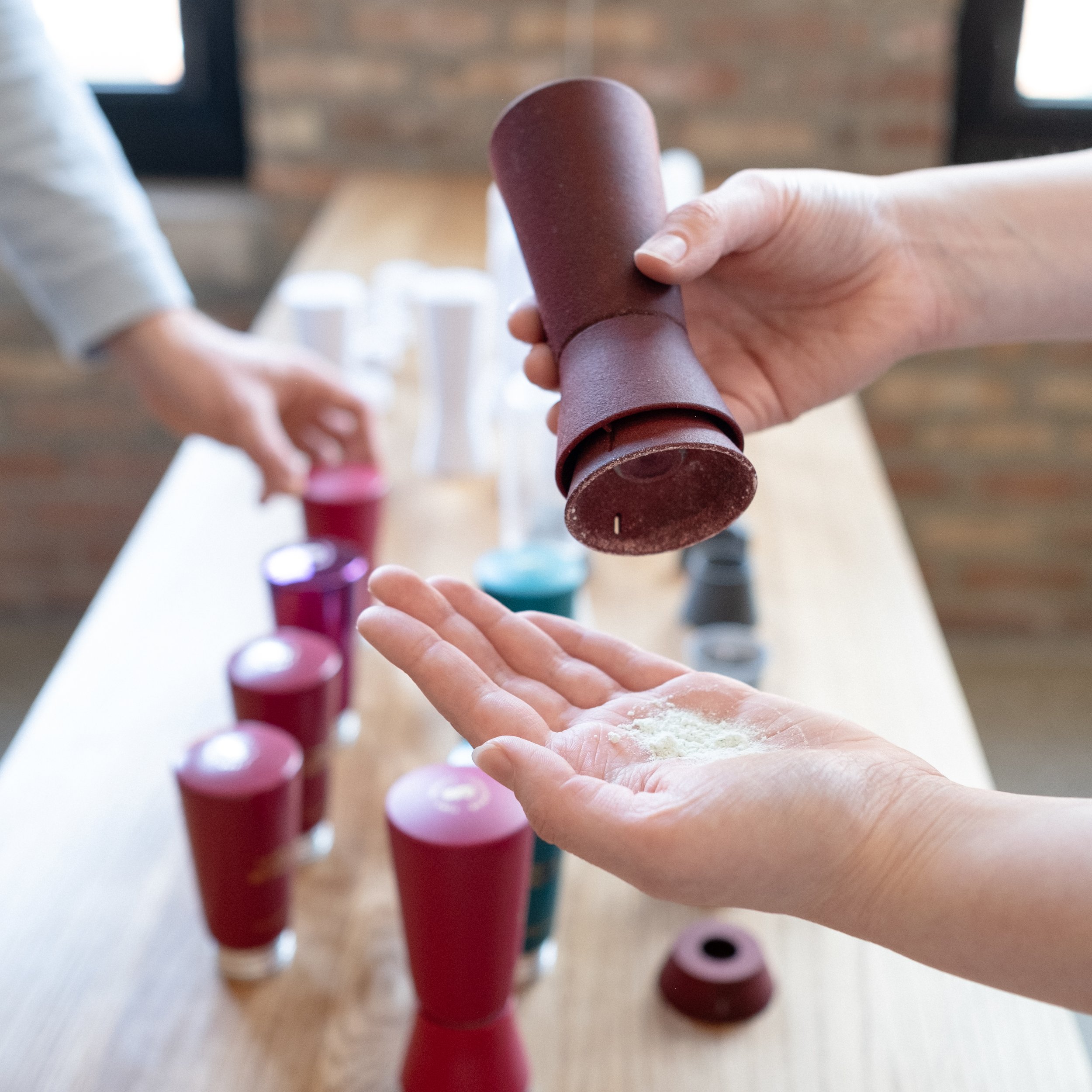 The bottom of the cap provides a stable base, but is also used to activate the dispensing mechanism by simply pressing the bottom of the bottle against your hand. And when it’s time to refill, the compostable paper refill tube is designed to perfectly fit into the bottle, ensuring the powder ends up in the bottle and not on the bathroom floor.